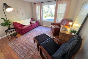 Bright, open living area with comfortable seating and smart TV